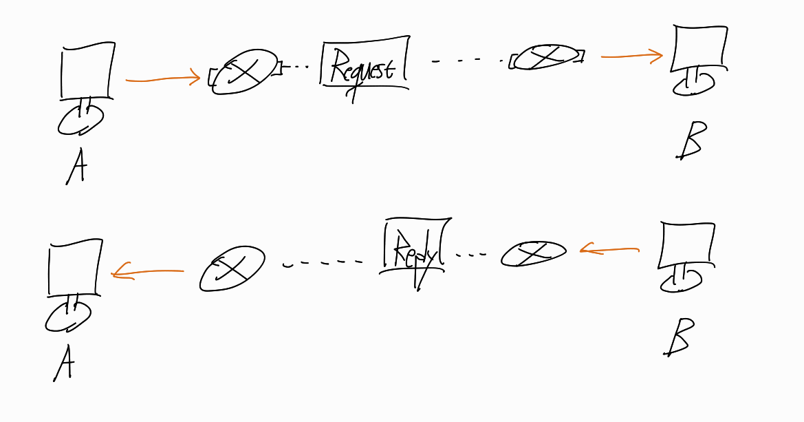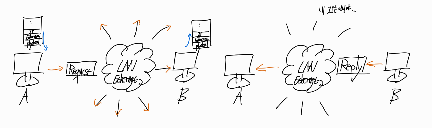 B는 이 패킷을 받고 자신의 주소를 적어 A에게 응답합니다.
