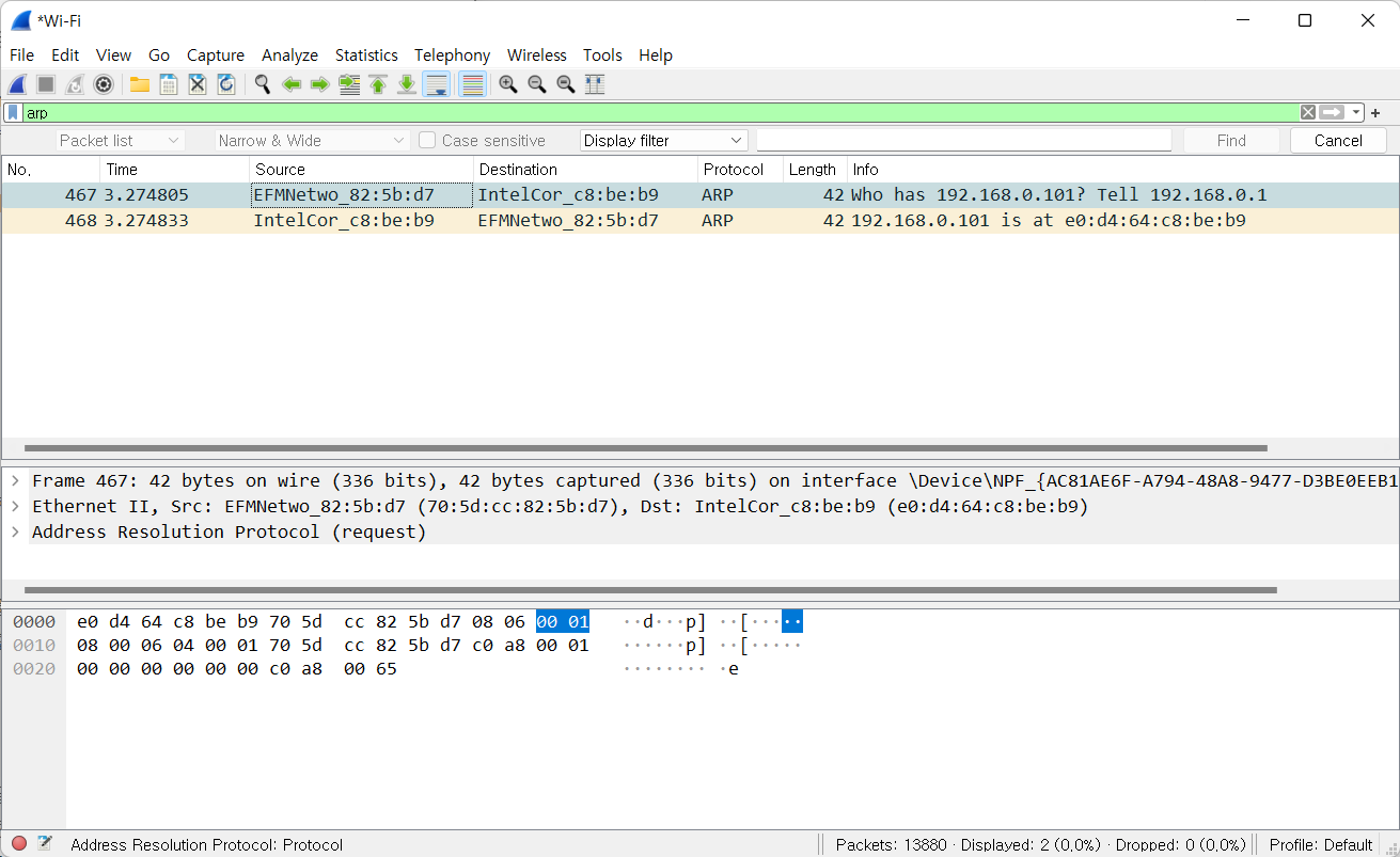 현재 아직 request packet이므로 target의 mac 주소는 0으로 채워져있습니다.